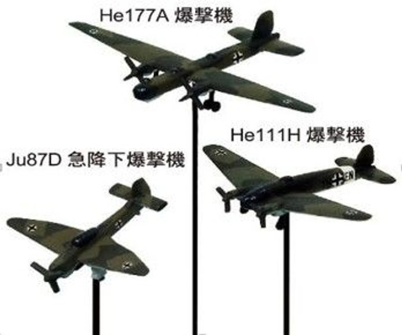 – Luftwaffe Ju-87D dive bomber x 2, He111H bomber x 2, He117A bomber x 1