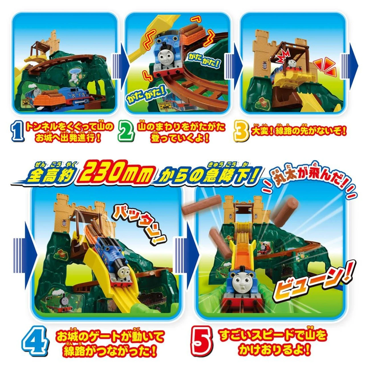 Product content: Mountain panel (1-4) (4), slope rail (AF) (6), slope rail (top) (bottom) (2), brake rail (1), bridge rail (1), bridge Gate (1), Bridge Rod (2), Wolfstead Castle Panel (1), Straight Rail (2), 1/2 Straight Rail (1), Curved Rail (6), Stop Rail (1), Thomas (Power) Car) (1), Log carrier (1), Log (3), Rail-flying freight car (1), Rail (Tal) (2), Seal (1), Parts order form (1)